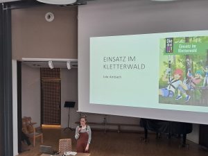 Mit „Eins, zwei, drei Power“ brachte die Kinderbuchautorin Jule Ambach zusammen mit den Schülerinnen und Schülern der dritten und vierten Klassen am 11.11.24 die Decke der Aula zum Beben. So lautet nämlich der Power-Ruf der drei !!!, wenn sie einen kniffligen Fall lösen müssen. Zunächst nahm uns Frau Ambach in den Kletterwald nach Dachsmoos im Schwarzwald mit. Gespannt lauschten die Kinder den vorgelesenen Episoden aus ihrem Buch „Einsatz im Kletterwald“. Danach ging es ans gemeinsame Ermitteln und Frau Ambach zeigte beispiehaft an einer Schülerin, wie man mit Graphitpulver Fingerabdrücke am Tatort abnimmt. Eine Fragerunde schloss sich an. Hier kam die Begeisterung der Kinder deutlich zum Ausdruck. Auch erfuhren sie, in welchem Buch das Rezept für Spaghetti Bolognese zu entdecken ist: „Escape School – Achtung, Zombies!“. Abgerundet hat Frau Ambach ihre Lesung mit einer Autogrammrunde.