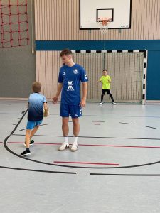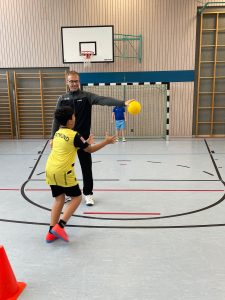 Nico war total nett und es hat sehr viel Spaß gemacht von ihm zu lernen. Zuerst kam das Aufwärmen. Wir sind mit dem Ball durch die Halle gelaufen, mussten prellen und uns die Bälle gegenseitig zu- spielen. Danach haben wir noch verschiedene Übungen gemacht. Zum Beispiel prellend Slalom laufen und dann auf das Tor werfen oder Hütchen auf einer Bank abwerfen. Eine Übung war auch toll, da ging es um Schnelligkeit und Reaktion und wir mussten uns alles gut merken. Man musste schnell verschieden farbige Hütchen ablaufen und Nico hat die Reihenfolge vorgegeben.